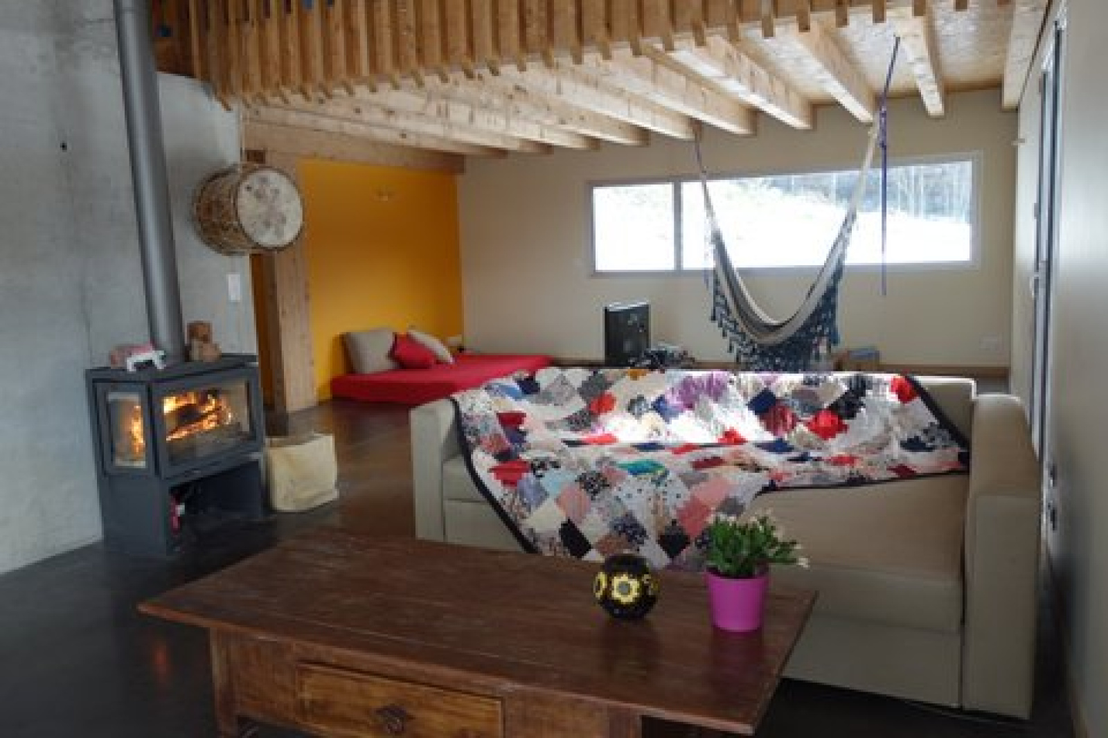 une entrée, un séjour/salon équipé d'un poêle à bois et ouvrant sur terrasse Sud/Est, , une cuisine partiellement équipée, une salle d'eau + WC,